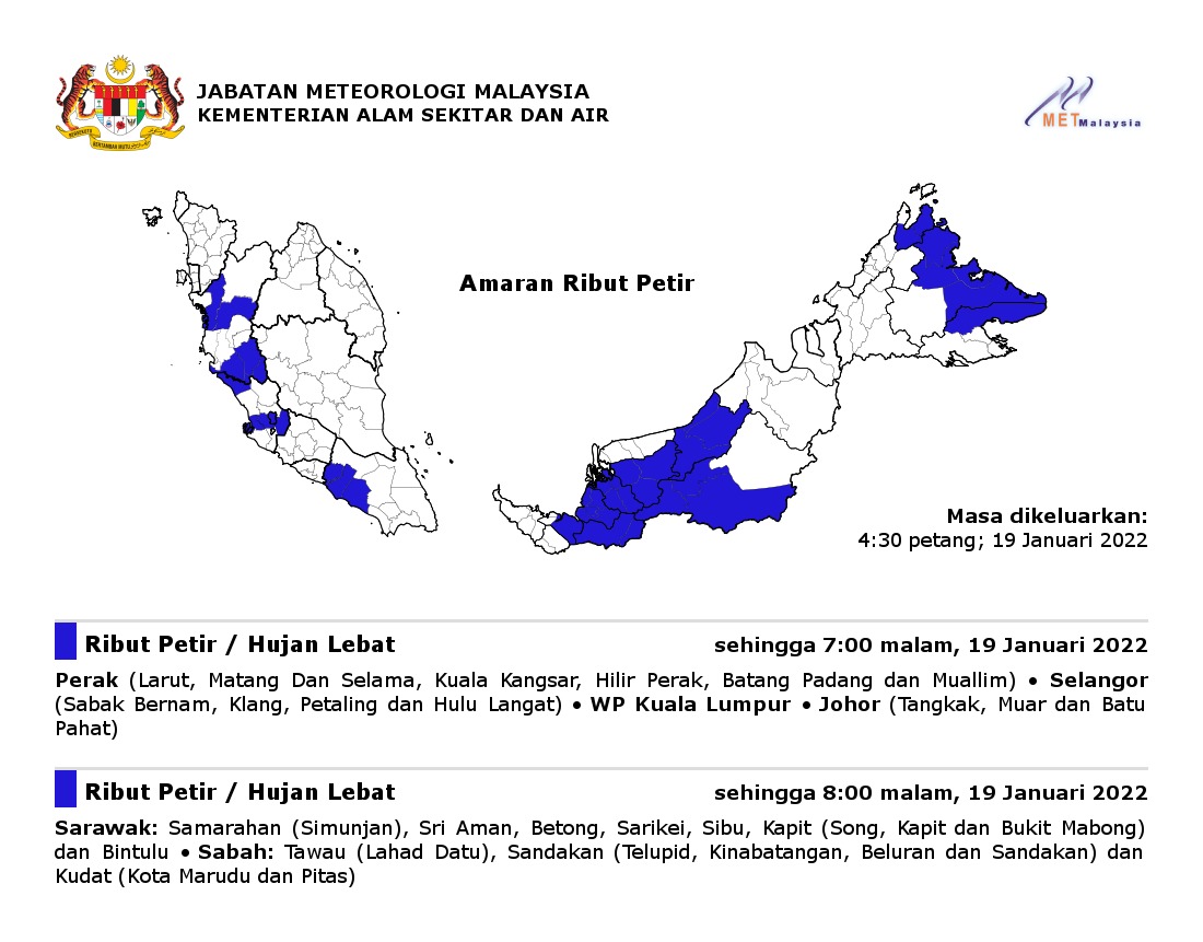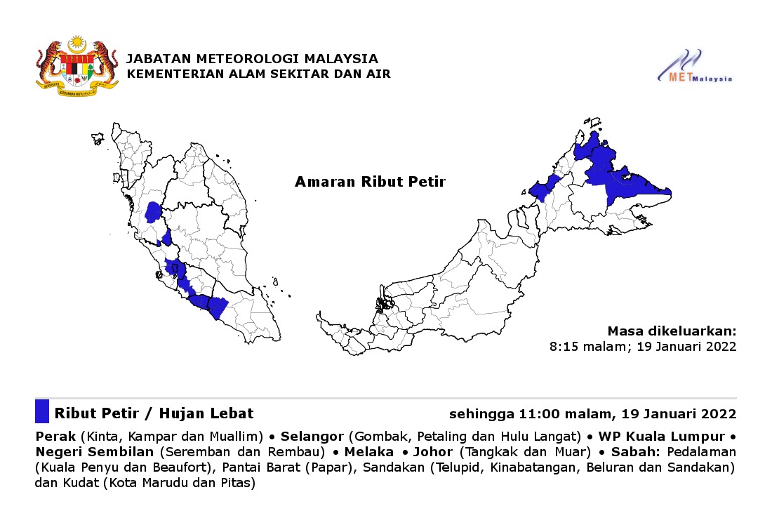 50 PENGERUSI JAWATANKUASA HAL EHWAL AGAMA ISLAM NEGERI. Jabatan Meteorologi Malaysia MetMalaysia mengeluarkan amaran ribut petir dan hujan lebat di Johor Sarawak dan Sabah sehingga pukul 5 petang ini. Jabatan Meteorologi Malaysia MetMalaysia mengeluarkan amaran hujan berterusan peringkat bahaya buruk dan waspada yang dijangka berlaku di kebanyakan negeri sehingga Selasa ini 4 Jan.